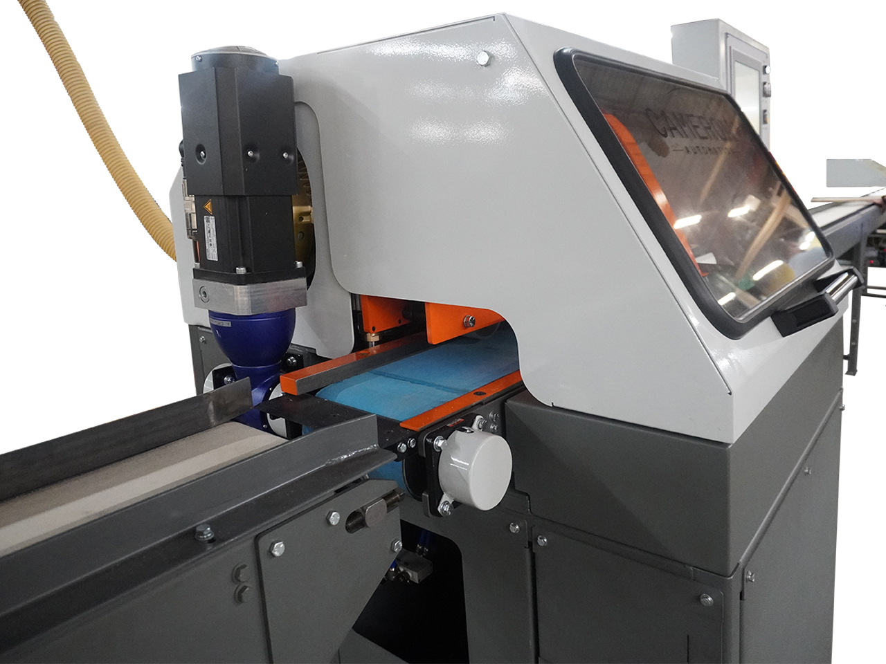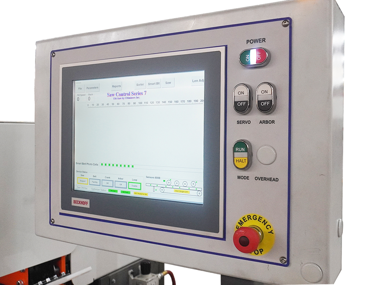 One or two operators crayon mark defects, parts transfer directly onto the smart belt equipped with a crayon camera. Parts are conveyed directly to the saw which removes defects as marked. Scrap is separated and component parts are conveyed and delivered to separate containers.