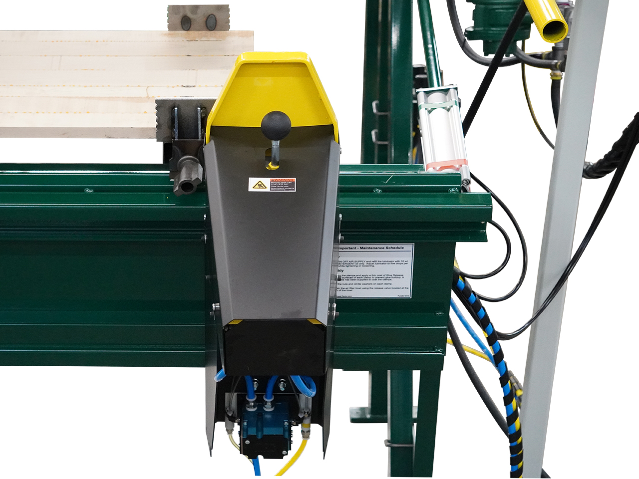 The Semi-Auto Clamp Carrier is our most versatile line of clamp carriers. Laminate Products such as Table Tops, Butcher Blocks, Stair Treads, Turnings, Mouldings, Cabinet Door Panels, Waste Recovery, Lumber Banding, and many more Applications.